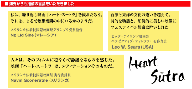 「ハート・スートラ〜般若心経〜」 インドネシア国際映画祭2012 審査員特別賞&優秀作品賞 スリランカ国際映画祭2009 準グランプリ ホノルル国際映画祭2009 Gold Kahuna Award(金賞) メキシコ国際映画祭2009 Gold Palm Award(金賞) ハワイ・ビッグアイランド映画祭2009 Golden Honu Award(金賞) ロサンゼルス Movie Awrads2011 入賞 ロサンゼルス Reel Film Festival2011 最優秀作曲賞&作品賞入賞 タイ国際映画祭 公式ノミネート フロリダ・デルレイビーチ映画祭 公式ノミネート イギリス・スワンジーベイ国際映画祭 公式ノミネート ハート・オブ・イングランド国際映画祭 公式ノミネート アイルランド国際映画祭 公式ノミネート 南アフリカ国際映画祭 公式ノミネート イリノイ・ルート66映画祭 公式ノミネート エジプト国際映画祭 公式ノミネート サンバレイ・スピリチュアル映画祭 公式ノミネート フロリダ・インディペンデント映画祭 公式ノミネート アメリカ/テレビ放送「エデュケーションチャンネル」で放送 「空 The Void」 スリランカ国際映画祭2010 Ligt of Asia賞 ホノルル国際映画祭2011 Gold Kahuna Award(金賞) ロサンゼルス Movie Awards2012 入賞 アフリカ国際映画祭公式ノミネート サンバレイ・スピリチュアル映画祭 公式ノミネート